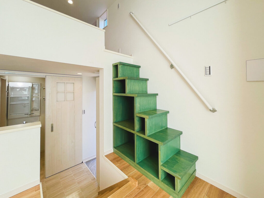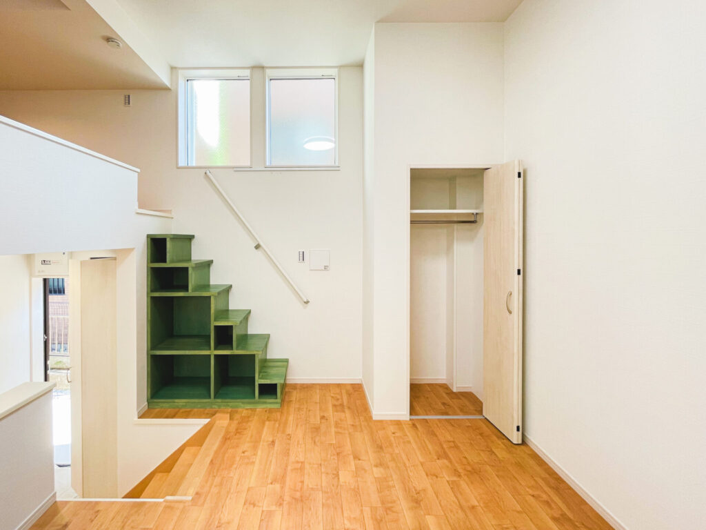 また、ロフトへのアクセスは足場が細いハシゴではなく、階段を設置することで安全性を保ちます。